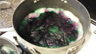 | Shortly after adding the food coloring to the pot. Wilton's is in the big pot on the left, McCormick's is in the smaller pot on the right. |